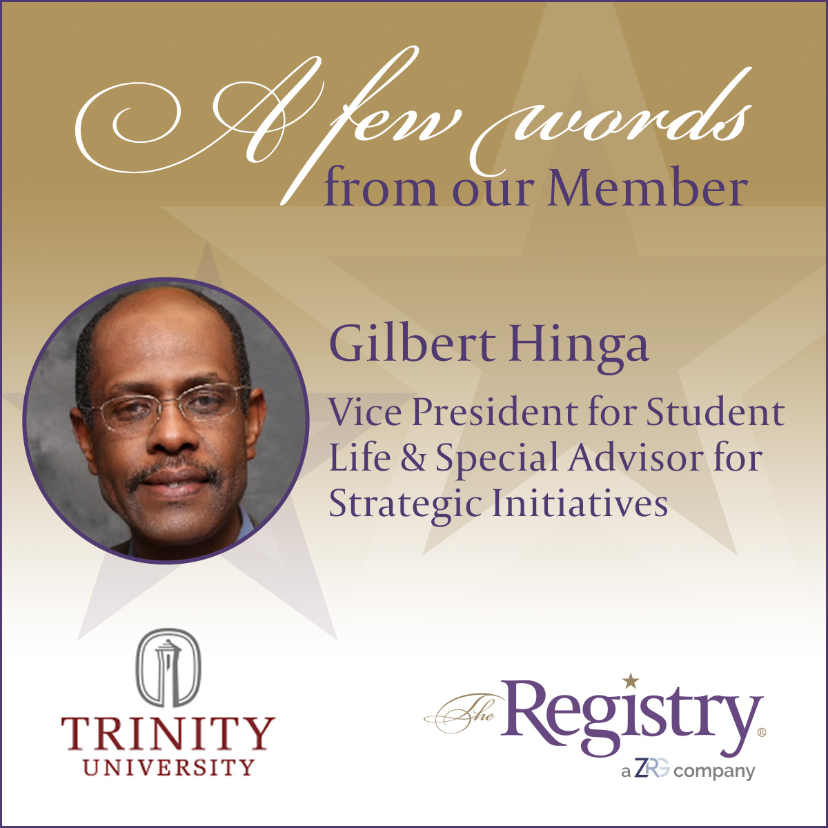 After a 20 plus-year career in higher education in Student Affairs, Gilbert Hinga joined The Registry so he could expand his national reach and impact in the field that he loves so much. Gilbert’s second assignment with The Registry started as Interim Vice President for Student Life at Trinity University, a private campus of about 2,500 students that is rooted in the liberal arts and sciences with pre-professional programs, in San Antonio, TX. After Trinity hired a permanent Vice President for Student Affairs, the president asked Mr. Hinga to stay on as Special Advisor for Strategic Initiatives.