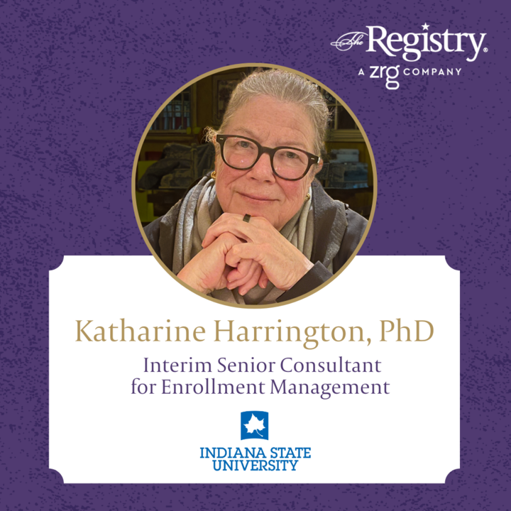 Congratulations to Registry Member Katharine Harrington, PhD for a successful interim placement as Senior Consultant for Enrollment Management. We are delighted that you are using your exceptional skills to make a positive impact at Indiana State University.