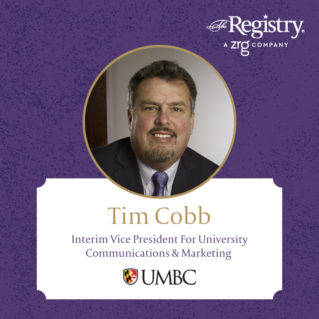 Congratulations to Registry Member Tim Cobb for his placement as Interim Vice President For University Communications & Marketing at the University of Maryland Baltimore County. In this role, Tim will oversee strategic communications and marketing to enhance the university’s image, build its brand, and engage key audiences, including students, faculty, staff, alumni, media, and potential donors.