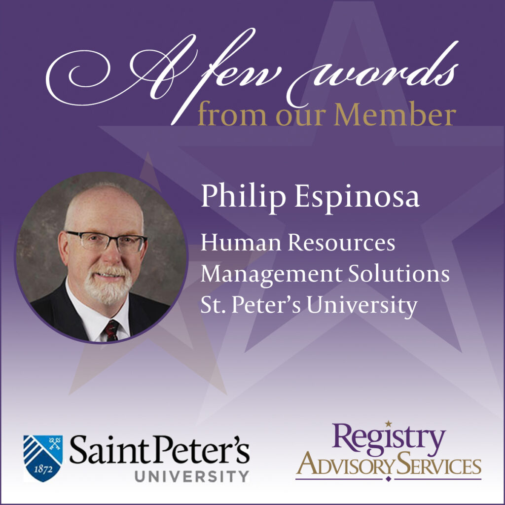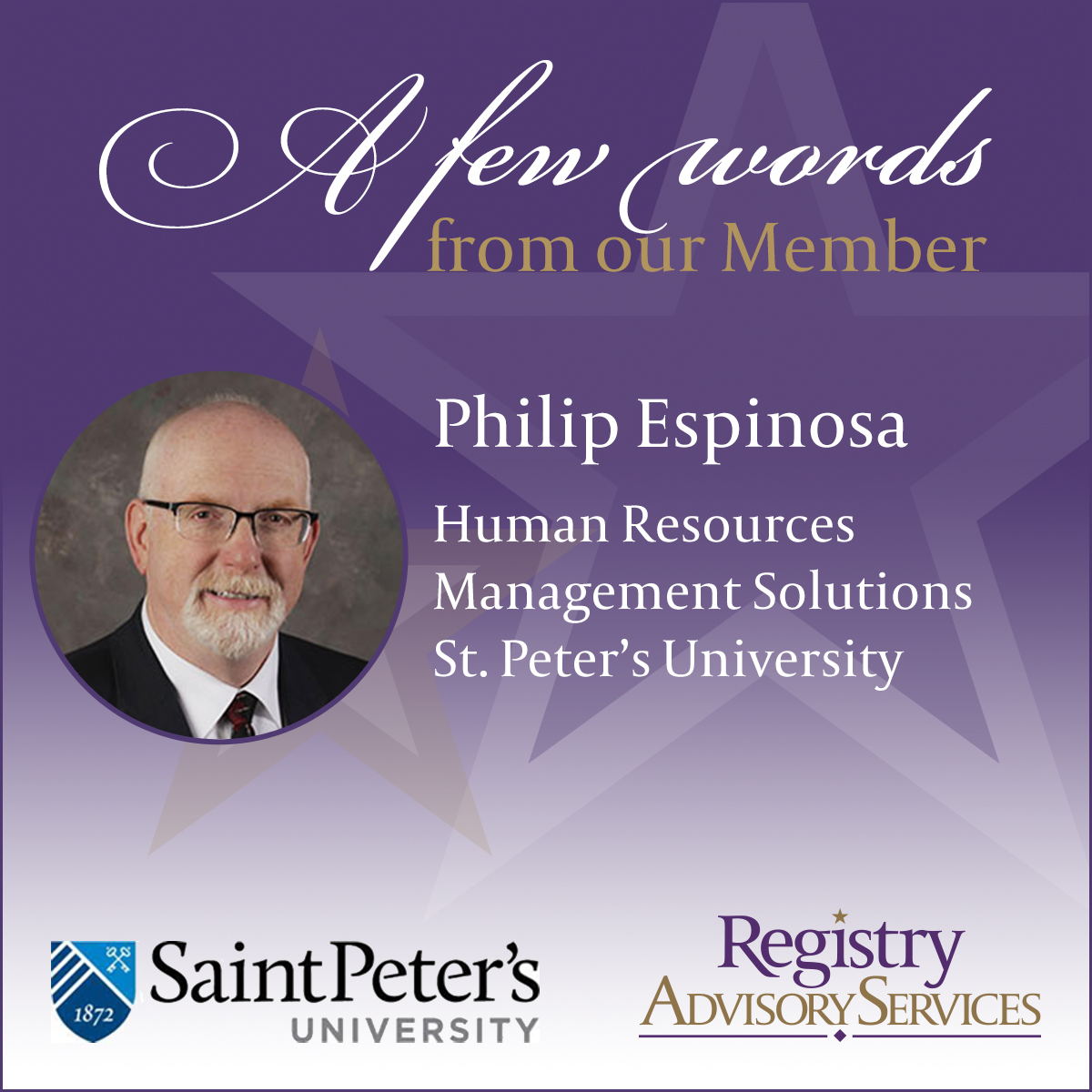 Many thanks to Registry Advisory Services’ Philip Espinosa, for this reflection of his current work with Saint Peter’s University staff to build a newer and stronger human resources model for their institution.