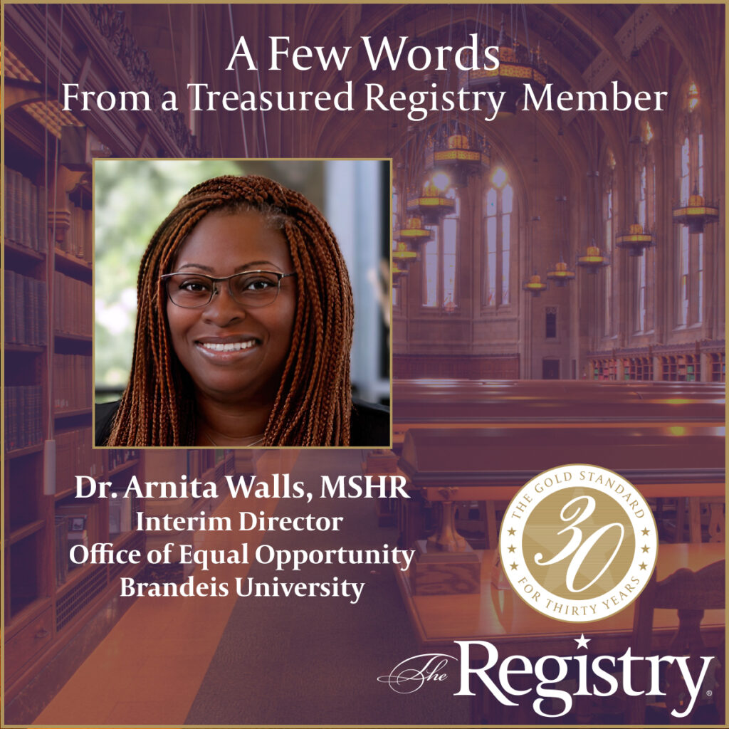 Take a moment to read this lovely testimonial from Registry Member Dr. Arnita Walls, MSHR elaborating on her current interim placement process and experience as Interim Director of the Office of Equal Opportunity at Brandeis University. Best of luck as you continue your placement, Arnita!