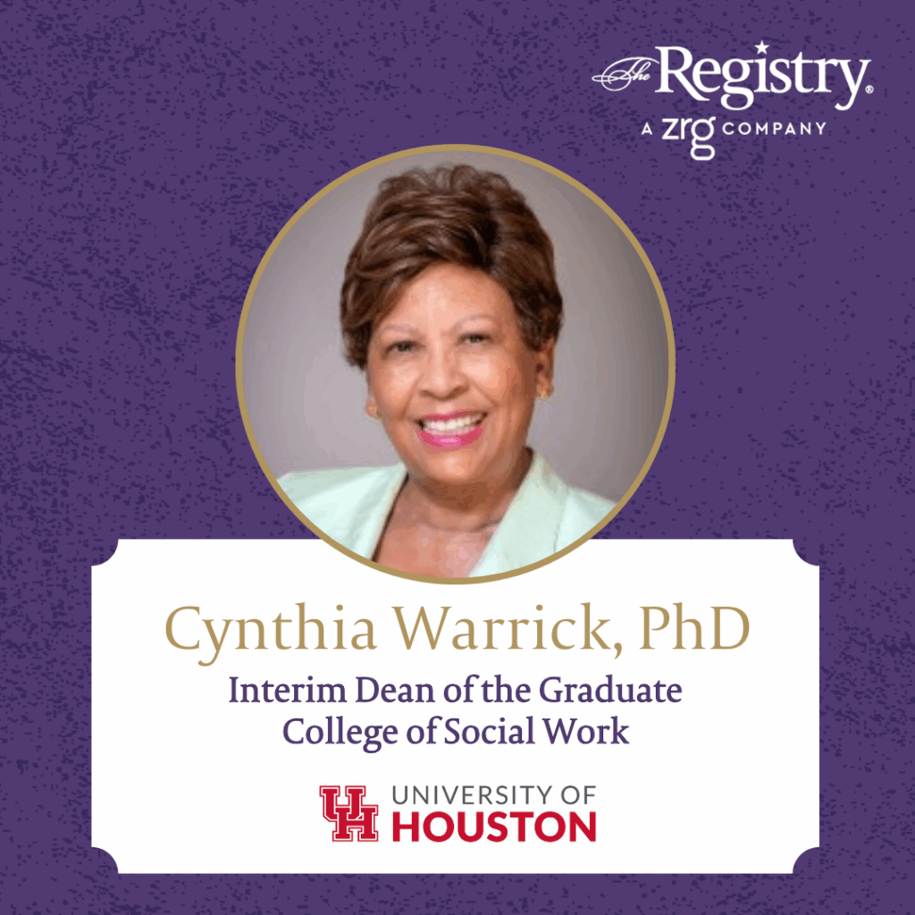 Thank you to Registry Member Cynthia Warrick, PhD, for sharing her insights from her first months as Interim Dean of the Graduate College of Social Work at the University of Houston. We are delighted that you are enjoying your placement!