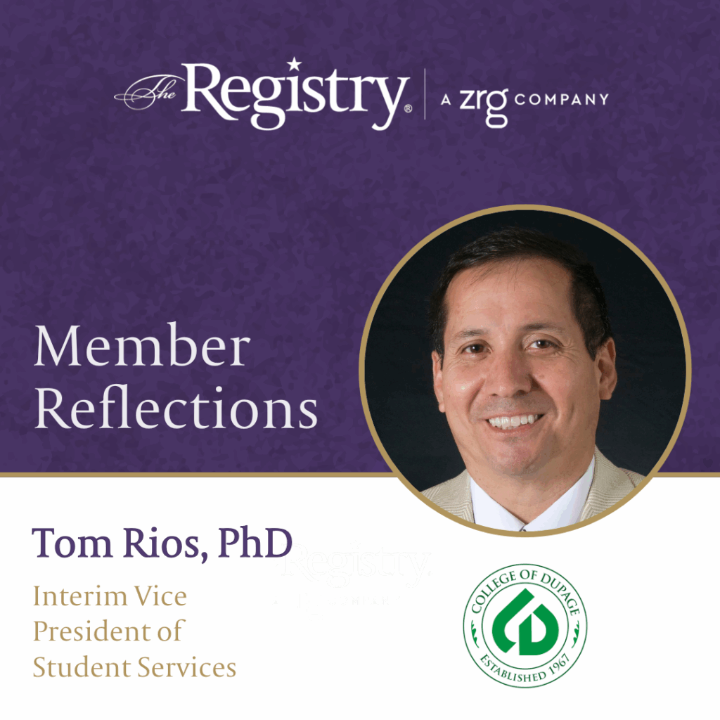 Thank you to Registry Member Tom Rios, PhD, for sharing his thoughts on his time as Interim Vice President of Student Services at the College of DuPage. We are pleased that he enjoyed the campus and are proud of the great work he accomplished.
