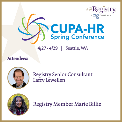The CUPA-HR conference starts today! Stop by Booth #108 and say “hi” to Registry Senior Consultant Larry Lewellen and Registry Member Marie Billie.