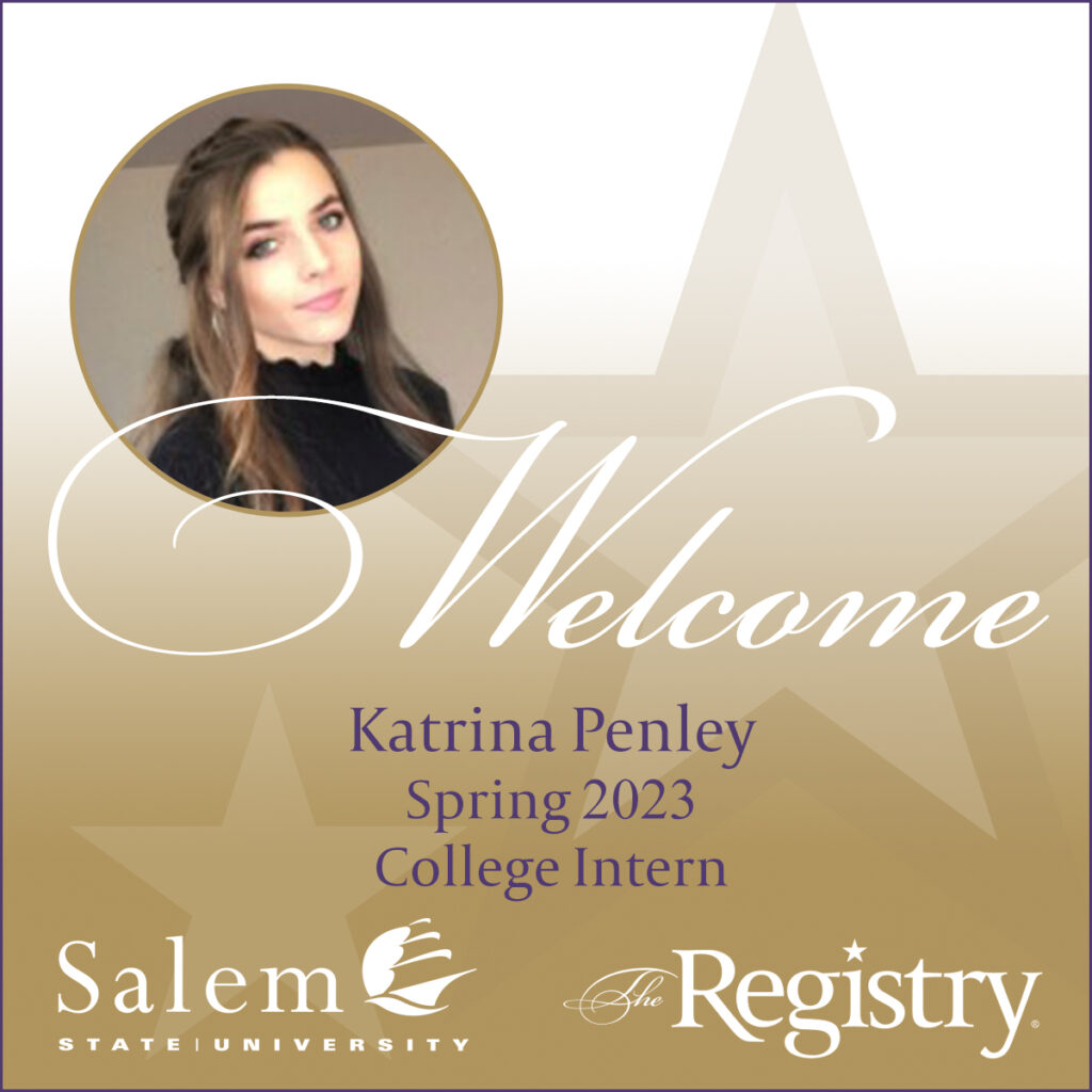 The Registry welcomes Katrina Penley who has taken on the role of our Spring 2023 College Intern. Katrina is a senior at Salem State University majoring in Media and Communications with a focus in Advertising. She also minors in Film Studies and Health Promotion. Katrina is a very busy senior this year and we are thrilled to have her. Welcome to The Registry, Katrina!