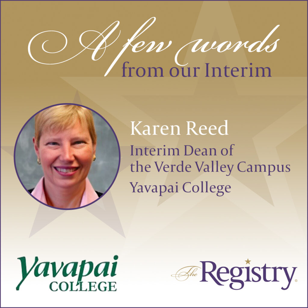 Each Registry Member’s resume and skillset are closely studied by our staff to ensure that they are matched with an institution that fits them perfectly. We are thrilled to hear from Registry Member Karen Reed that her experience as Interim Dean of the Verde Valley Campus at Yavapai College was nothing short of successful.