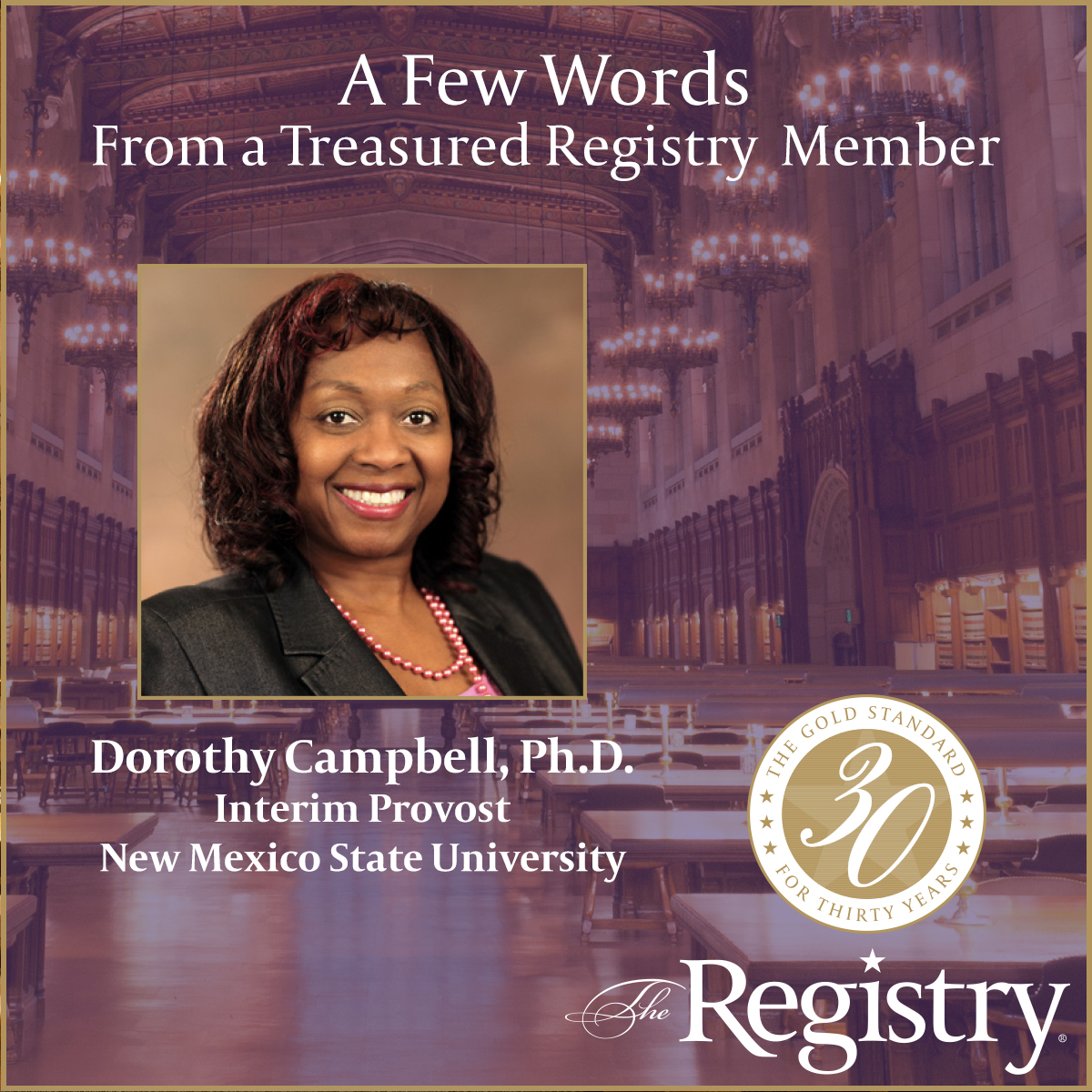 “Not ready to retire? Neither was I, there is far too much to do! Thanks to The Registry, I am matched with great institutions and help them transform their visions and strategic plans into realities. For me, this often involves promoting student excellence, transformative curriculum, diversity-equity-inclusion and community engagement. Living in different regions and contributing to higher education nationwide is work that matters. Join us, explore The Registry.”