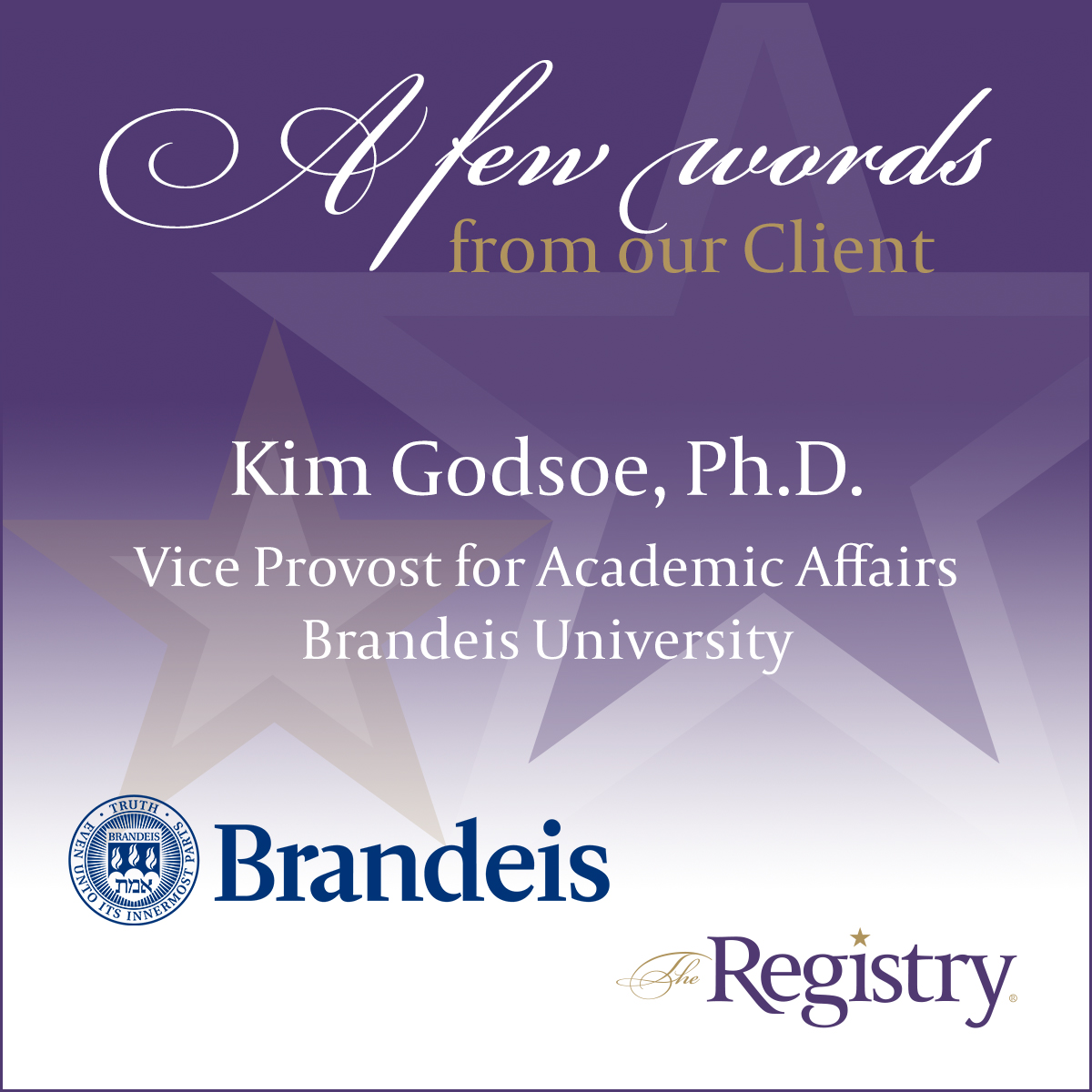 A wonderful testimonial from Kim Godsoe, Ph.D., Vice Provost for Academic Affairs, about her positive experience working with Interim Dean of Academic Services, Ann Branchini, at Brandeis University.