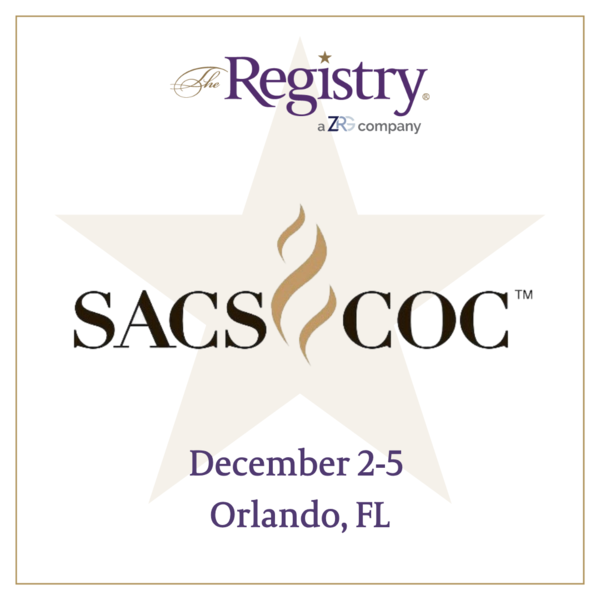 The SACSCOC Annual Meeting begins tomorrow in Orlando, FL. We are honored to have Bob Smith, Ph.D., Registry Member and Senior Consultant, and Karin Strohbeck representing us at this event. We hope you’ll stop by Booth #526 and say “hello!”